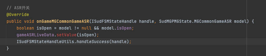 When the mini-game enters the ASR scene, it will automatically start the ASR capability. At this point, it will send the MG_COMMON_GAME_ASR state to the App with isOpen == true, as seen in SudFSMMGListener.onGameMGCommonGameASR.