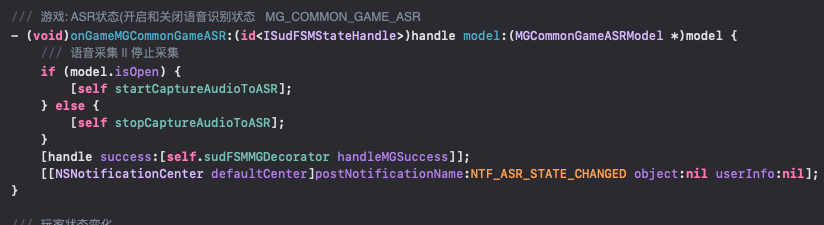 App收到 MG_COMMON_GAME_ASR状态, isOpen == YES后, 调用声网接口AgoraRtcEngineKit的方法:
